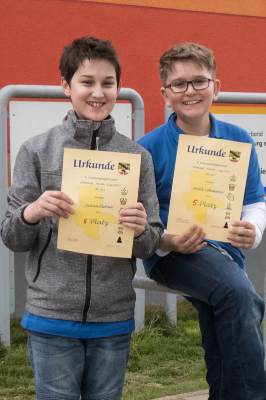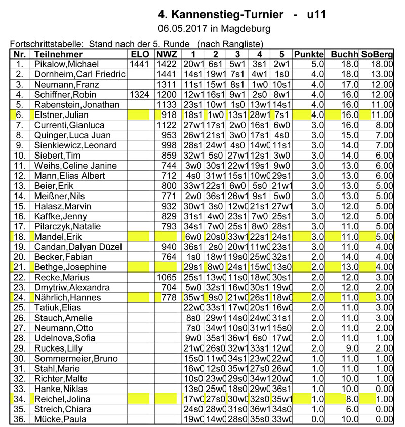 Im u11- Turnier spielten Julian Elsner, Hannes Nährlich, Erik Mandel, Josephine Bethge und Jolina Reichel. mit 4,0 Punkten belegte Julian den hervorragenden 5.Platz vor Erik als 17. mit 3,0 Punkten. Dahinter auf Platz 21 und 24 folgen Josephine und Hannes mit jeweils 2,0 Punkten. Auf den 34.Platz landete Jolina von insgesamt 36 Teilnehmern.