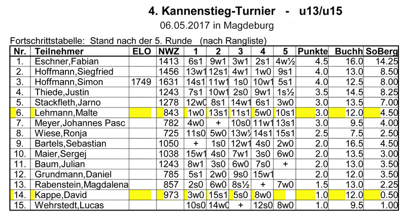 Im u13-Turnier spielten David Kappe und Malte Lehmann. Malte konnte sich mit 3,0 Punkten auf den 6.Platz setzen vor David, der mit 1,0 Punkt den 14.Platz belegte.