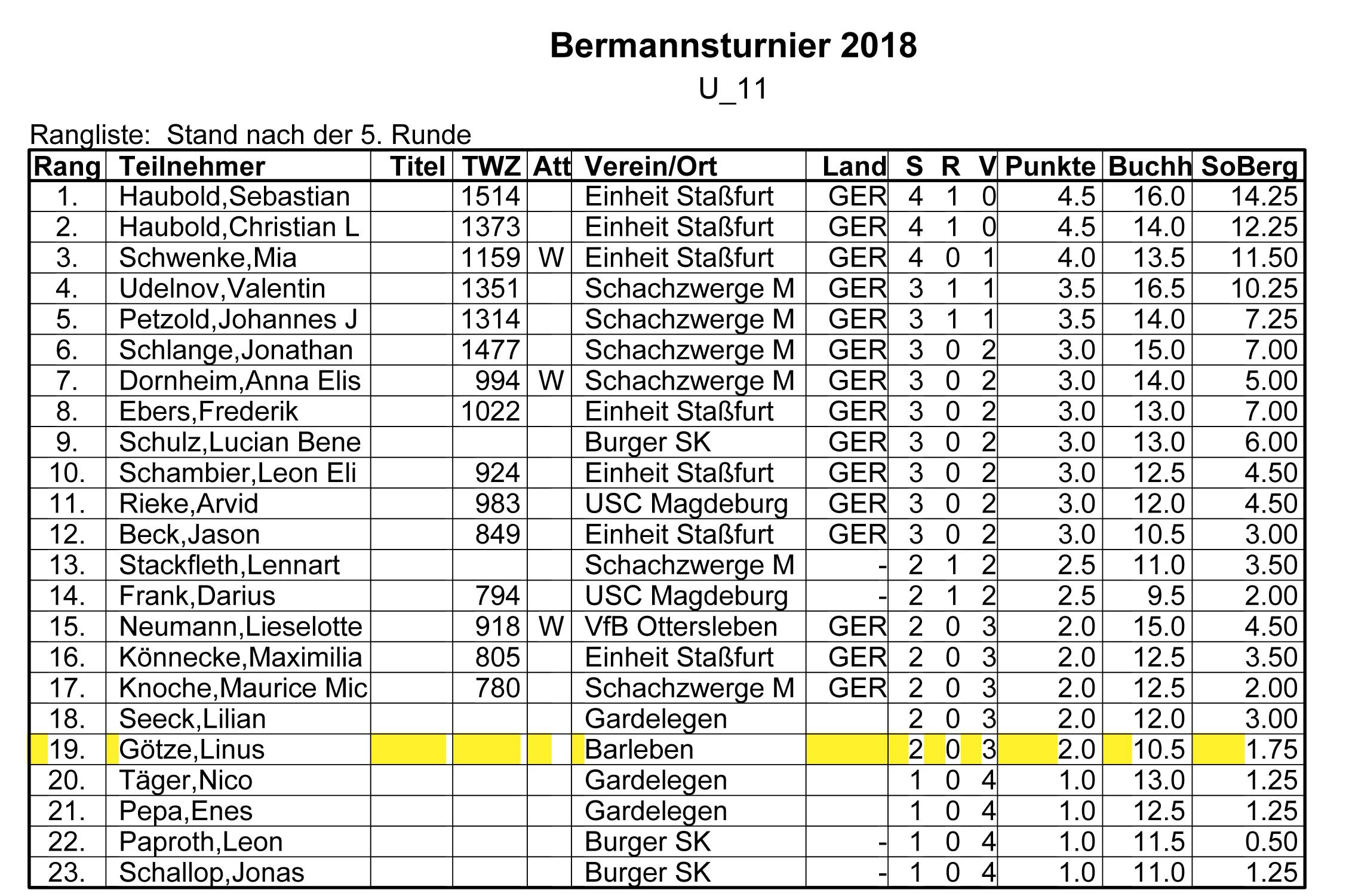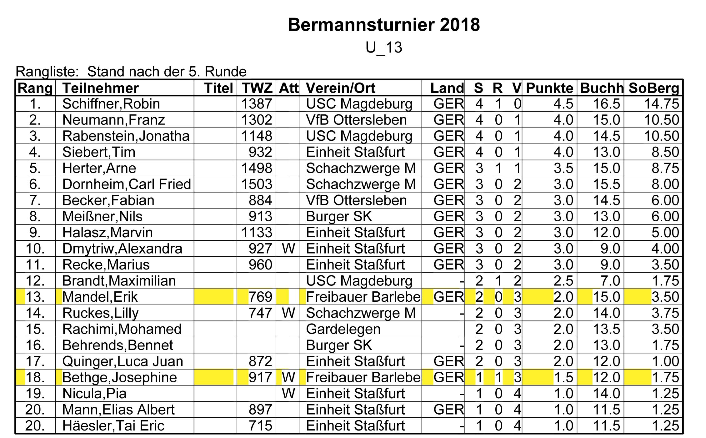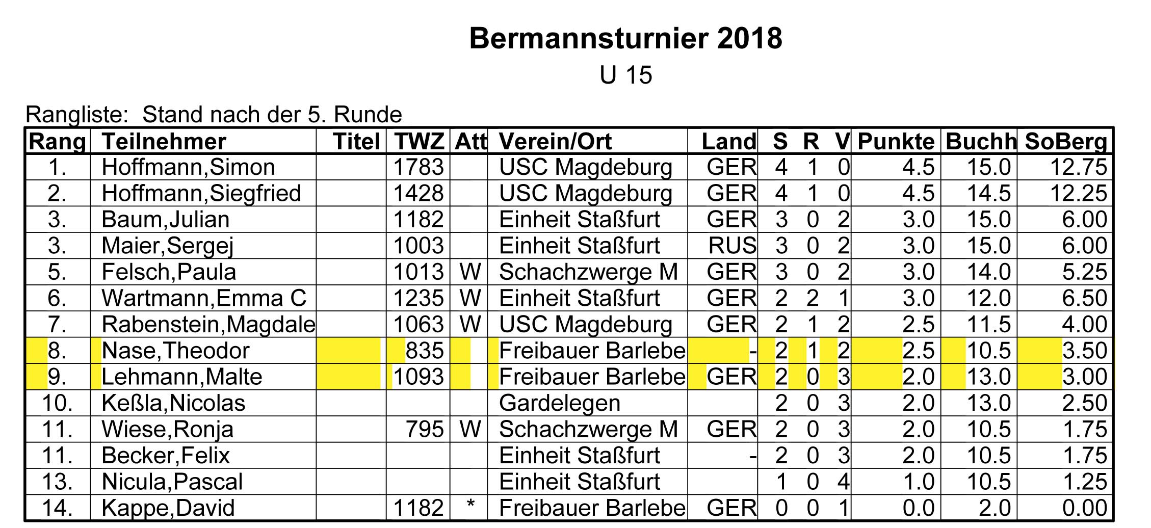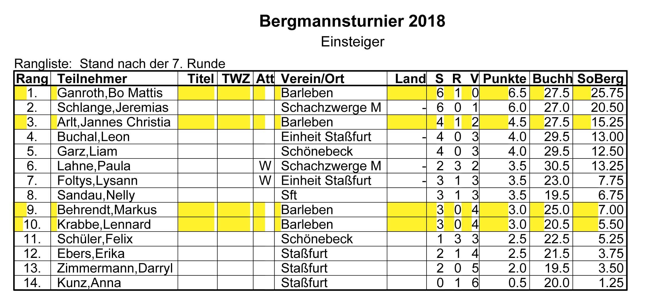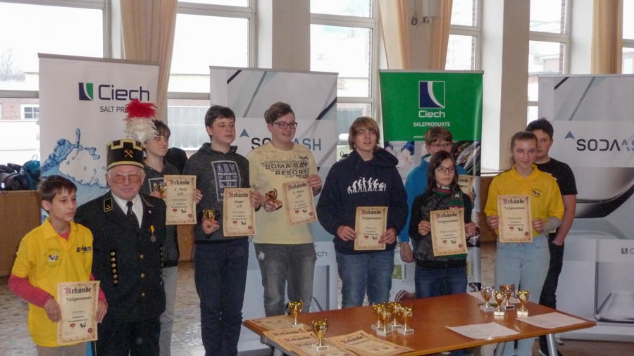 Am 24.November 2018 fand das 4.Staßfurter Bergmannsturnier im Großen Saal des Sodawerkes statt. Aus unserem Verein waren 9 Schachtalente am Start. Im Einsteiger- Turnier spielte Bo Mattis Ganroth, Jannes Arlt, Markus Behrend und Lennard Krabbe Mit 6,5 Punkten belegte Bo Mattis den 1.Platz !!!, kurz dahinter landete mit 4,5 Punkten Jannes den 3.Platz und auch unsere Jüngsten Markus und Lennard erzielten jeweils 3,0 Punkte und die Plätze 8 und 9. Im u11- Turnier spielte Linus Götze. Mit 2,0 Punkten belegte Linus den 19.Platz von 23 Teilnehmern. Im u13-Turnier spielte Josephine Bethge und Erik Mandel. Mit 2,0 Punkten belegte Erik den 13.Platz, vor Josephine mit 1,5 Punkten den 18.Platz. Im u15-Turnier spielten Malte Lehmann und Theodor Nase. Mit 2,5 Punkten erzielte Theo noch das beste Ergebnis und landete auf den 8.Platz, vor Malte mit 2,0 Punkten und Platz 9. Zum Schluß möchte ich noch den Organisatoren und den vielen Helfern für das gut durchgeführte Turnier danken. | |||||||||||||||||||||||||||||||||||||||||||||||||||||||||||||||||||||||||||||||