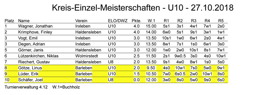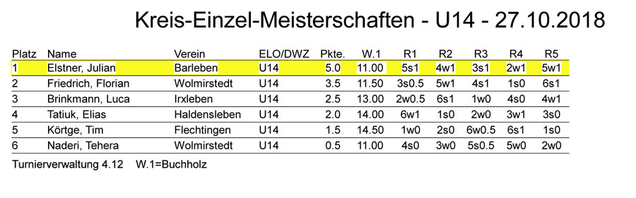 Bericht zur Kreiseinzelmeisterschaft 2018 Am 27.10.2018 richtete der Schachverein "Haldensleber Schachclub" in dem Mehrgenerationenhaus die diesjährige Kreiseinzelmeisterschaft der Kinder und Jugendlichen des Bördekreises aus. Das Turnier begann um 9 Uhr mit einer Teilnehmerzahl von 31 Schachspielern. Das Turnier wurde im Rundensystem bzw. im Schweitzer System je nach Teilnehmerzahl in den einzelnen Altersgruppen mit einer Spielzeit von 20 Minuten durchgeführt. Der Turnierleiter Schachfreund Seidel wurde unterstützt von den Schachfreunden Meyer, Feldmann, Gaertig, Frenzel und Linke. Gespielt wurde in den Altersklassen U8, U10, U12, U14, U16 und U18. Die Plätze 1-3 wurden mit einer Urkunde und Medaille ausgezeichnet. Die Barleber Schachspieler belegten in der Altersklasse U8 mit Joel Schäfer den 2. Platz. In den Altersklassen U14männlich und U12 weiblich erspielten Julian Elstner und Josephine Betghe den Kreismeistertitel. Wir Barleber Schachspieler möchten uns für die reibungslose Durchführung des Turnieres bei den Haldensleber Schachspielern bedanken. Mit schachlichen Grüßen Werner Linke | |||||||||||||||||||||||||||||||||||||||||||||||||||||||||||||||||||||||||||