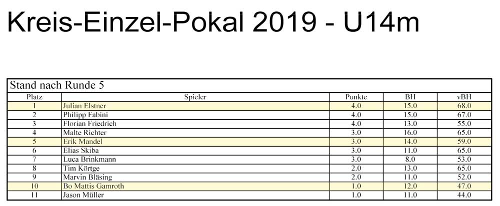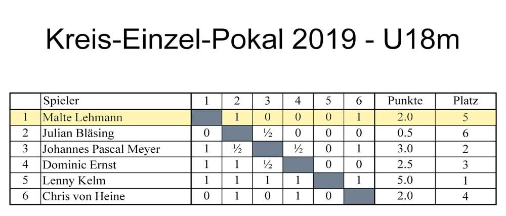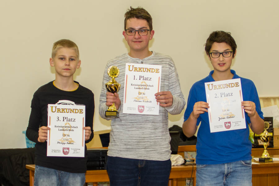 Am 02.03.2019 richtete der Haldensleber Schachclub im "EHFA - Haus" den diesjährigen Kreiseinzelpokal der Kinder und Jugendlichen aus. Das Turnier begann um 9.00 Uhr mit einer Teilnehmerzahl von 38 Schachspielern. Das Turnier wurde im Schweitzer System (5Runden) durchgeführt. Der Turnierleiter Schachfreund Seidel wurde unterstützt von den Schachfreunden Linke (Barleben), Feldmann (Irxleben), Gaertig und Meyer aus Haldensleben. Der Pokal wurde in den Altersklassen U10, U14, U14w und U18 ausgespielt. Malte Lehmann spielte in der U18 Gruppe und erreichte mit 2,0 Punkten den geteilten 4.Platz.. Julian Elstner, Erik Mandel und Bo Mattis Gamroth spielten in der U14-Gruppe. Am Ende standen mit Julian noch 2 Spieler mit 4 Punkten ganz vorn in der Tabelle, so daß ein Stichkampf den Pokalsieger ermitteln sollte. Julian konnte nur eine Blitzpartie gegen den 3. Philipp Fabini gewinnen. Die 2.Blitzpartie verlor er gegen Florian Friedrich, der gegen Philipp Fabini auch gewann und somit der Pokalsieger 2019 wurde. Julian erreichte somit den 2.Platz . Erik konnte mit 3,0 Punkten den 5.Platz sichern. Bo Mattis mußte mit 1,0 Punkten Lehrgeld zahlen und wurde 10. I der Altersklasse U10 erreichte Linus Götze mit 3,0 Punkten den 5.Platz. Abgeschlagen auf den Plätzen 14 - 16 landeten unsere Turnierneulinge Reyk Schemel, Lennard-Lasse Krabbe und Philip Rode. | |||||||||||||||||||||||||||||||||||||||||||||||||||||||||||||||||||||||||||||||||||