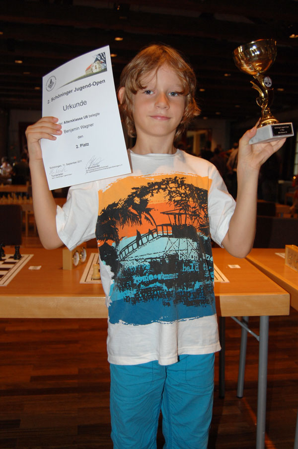 Hallo liebe Jugend-Schachtrainer, wir haben heute am Sonntag einen Familien-Ausflug zum Schöninger Schloß gemacht, wobei dort Dominik und Benjamin beim 2.Jugendopen mit fast 70 Teilnehmern mitgespielt haben. Benjamin hat hier ein starkes Turnier gespielt und hatte sich nach der 8.Runde in der Altersklasse U8 mit 5/8 Pkt. den 2.Platz erkämpft. Trotz einer Niederlage in der letzten Runde gegen einen zu starken U18 Gegner konnte er den zweiten Platz verteidigen und hat hinter A.Niemann (Aufbau Elbe MD)seinen ersten Schach-Pokal errungen, auf den er sehr stolz ist. Auch Dominik hatte nach der 8.Runde noch Chancen auf einen Platz auf dem Treppchen. In der letzten Runde hat er aber seinen Gegner in einem klar gewonnenen Endspiel nur patt gesetzt. Mit insgesamt 4,5/9 hat er insgesamt auch ein gutes Turnier gespielt. Viele Grüße Klaus | |||||||||||||||||||||||||||||||||||||||||||||||||||||||||||||||||||||||||||||||||