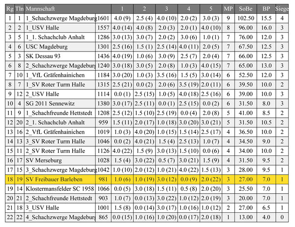 Am nächsten Morgen begann um 9.00 Uhr die 4.Runde gegen USV Halle II. Trotz meiner üblichen Ansprache langsam und vernünftig zu spielen, konnte diesmal keiner unserer Spieler gewinnen. Es schlichen sich zu viele kleine Fehler ein, welche die Gegner ausnutzten und uns mit 4 zu 0 die größte Niederlage beibrachten. | |||||||||||||||||||||||||||||||||||||||||||||||||||||||||||||||||||||||||||||||||||||||||||||||||||||||||||||||