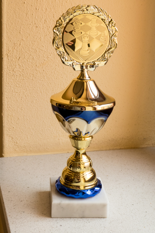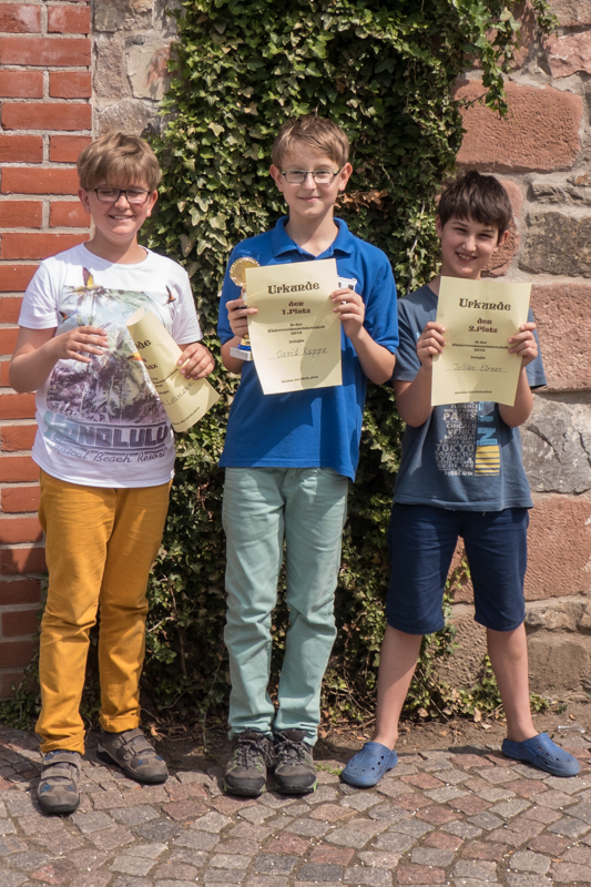 Erwartungsgemäß setzten sich die geübten Spieler Malte, Julian und David nach 3 Runden vom Rest ab, wobei Malte diesmal nicht so konzentriert war und seine Partien gegen David und Julian verlor. Damit waren Julian und David vor der letzten Runde mit 4 Punkten in Führung gegangen. Somit fiel die Entscheidung um den Pokal in der letzten Runde im direkten Kampf zwischen David und Julian. Diese Partie war lange Zeit ausgeglichen, wobei bei entgegengesetzten Rochaden meist der gewinnt, wer es zuerst schafft, einen gefährlichen Angriff zu starten. Dies war am heutigen Tag David, der seinen Gegner auch noch mattsetzen konnte und damit 1.Kindervereinsmeister wurde. Julian erreichte trotz Niederlage den 2.Platz, gefolgt von Malte auf den 3.Platz. |